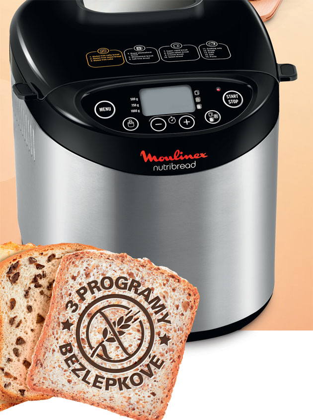 Pekáreň na chlieb Moulinex Nutribread sa vyznačuje množstvom programov na bezlepkové a zdravé pečenie. Na zdravé pečenie tu nájdete tri ľahko nastaviteľné programy – rýchly celozrný, celozrný a bez soli. Ďalšie tri programy ponúkajú možnosť pečenia bez lepku – bez-lepkový slaný, bezlepkový sladký a bezlepkový bez soli. Sami si tak jednoducho a pod plnou kontrolou pripravíte svoj obľúbený chlieb či múčnik.