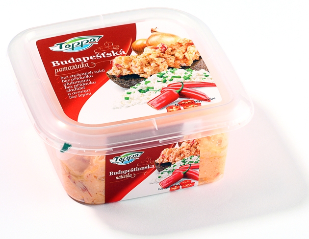 Toppo Budapeštianska nátierka – tajomstvom zaujímavej chuti tejto nátierky je čerstvý jemný tvaroh, marinovaná cibuľa a sterilizovaná kapia. Môžeme ju podávať s bielym i tmavým pečivom a čerstvou sezónnou zeleninou. Pre toho, kto obľubuje štipľavú chuť, ozdobíme chlebík s nátierkou pokrájanými feferónkami. Kúpime ju v praktickom balení 135 g.